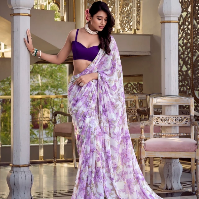 Grace meets comfort in our Purple Pearl Lace Floral Saree — a perfect blend of floral charm and effortless style. Crafted from ultra-lightweight marble fabric, this saree showcases soft floral prints along with a dainty pearl lace border that adds a refined touch. The rich purple hue offers a hint of royal elegance, making it a lovely choice for festive mornings, casual parties, or intimate celebrations.
